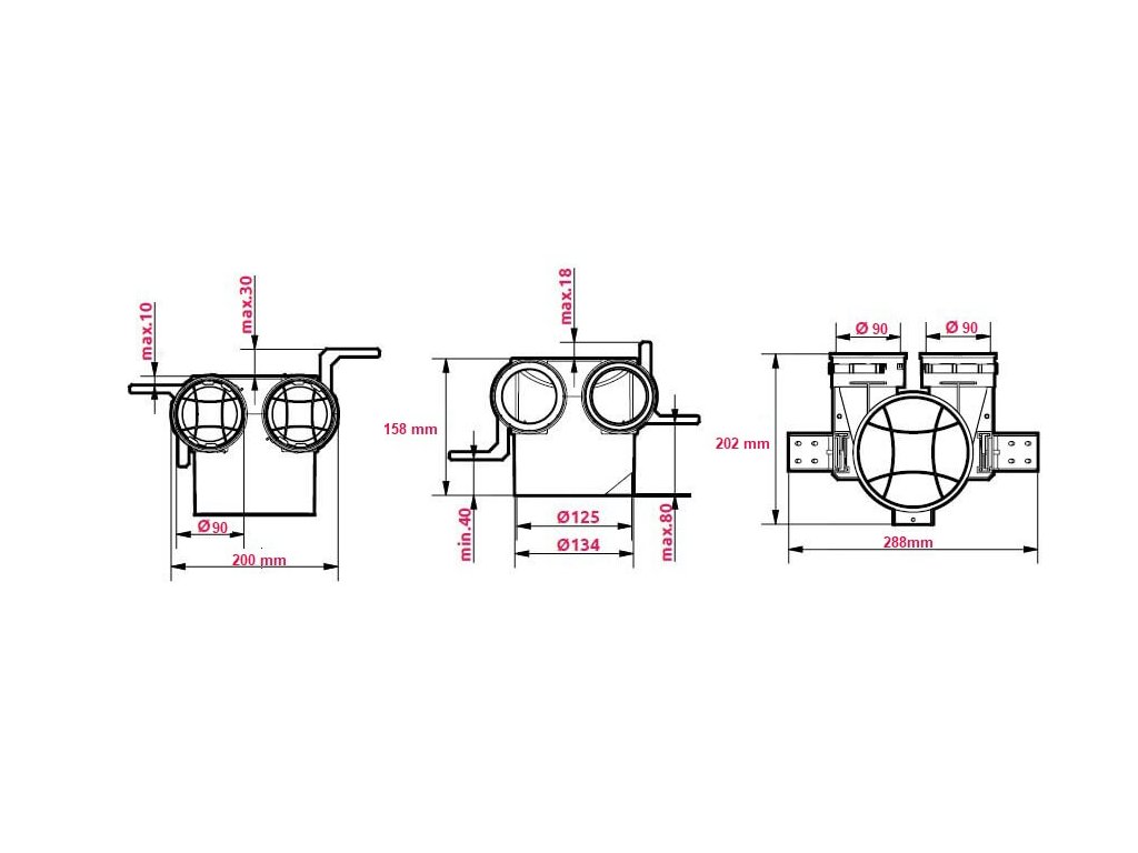 Inštaláciu boxu uľahčujú úchyty s nastaviteľnou výškou montáže pre prispôsobenie montážnym miestam. Zaručujú rýchlu a jednoduchú inštaláciu distribučných boxov v mieste inštalácie. Box umožňuje pripojiť maximálne dve vetracie potrubia Ø90 mm na prívodný alebo výfukový difúzor. Montáž je možná na podlahu/stenu/strop: betón, sadrokartón.