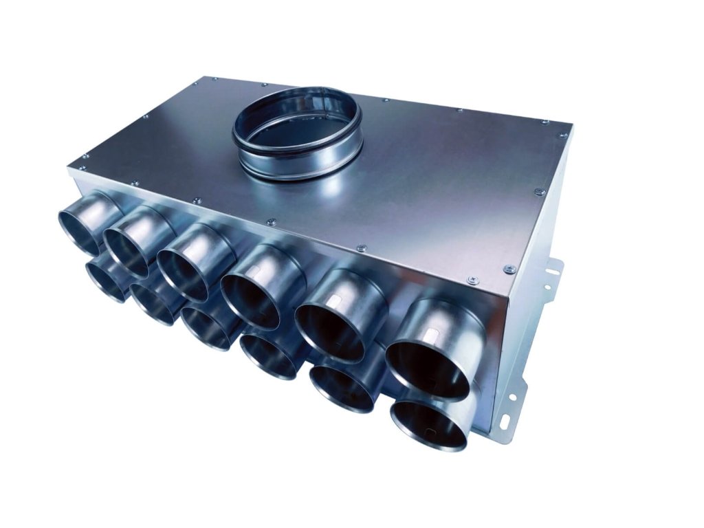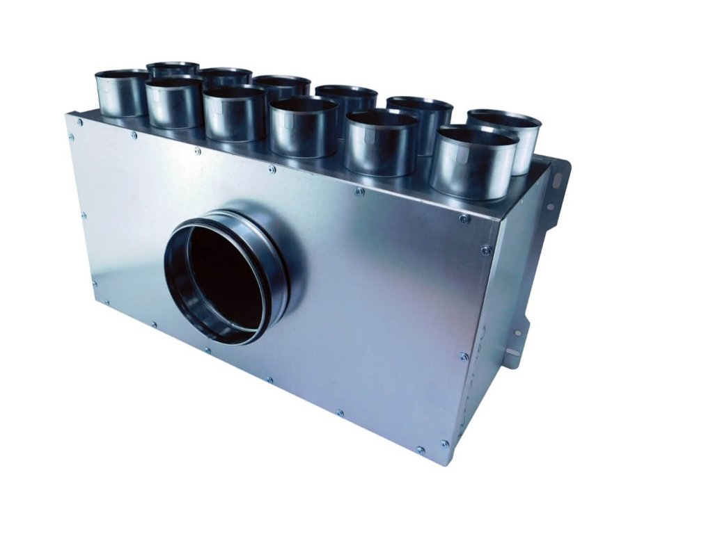 Rozdeľovací box vyrobený z pozinkovaného plechu pre PE FLEX potrubia.