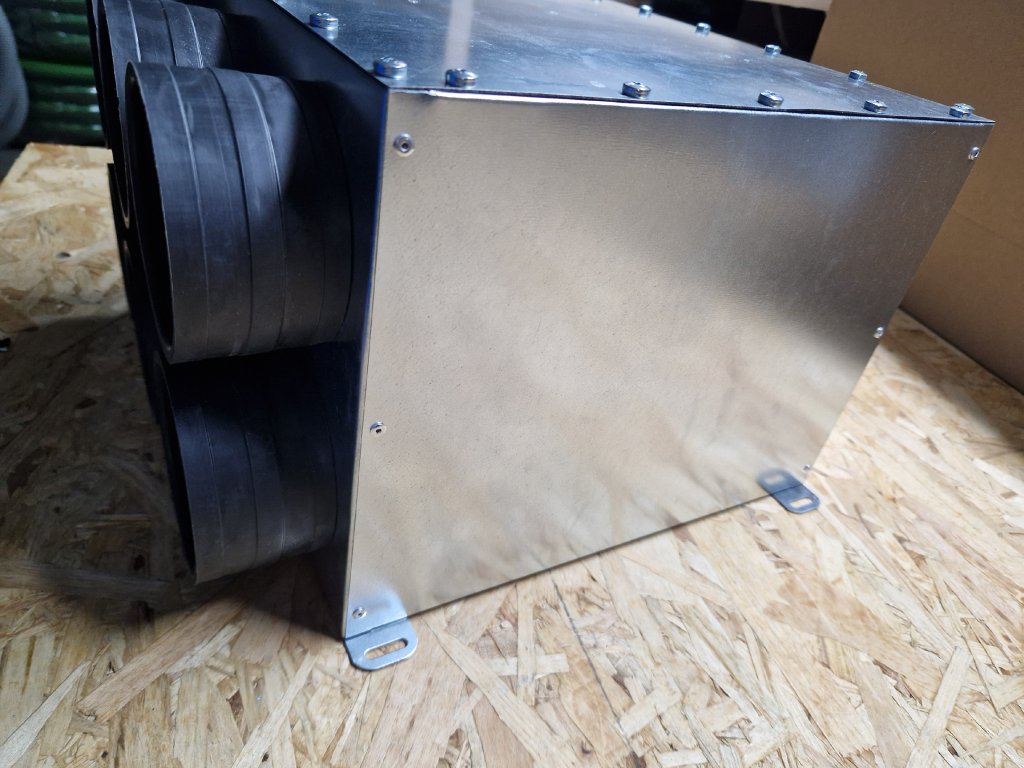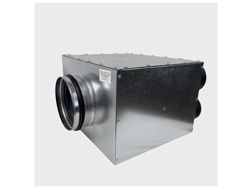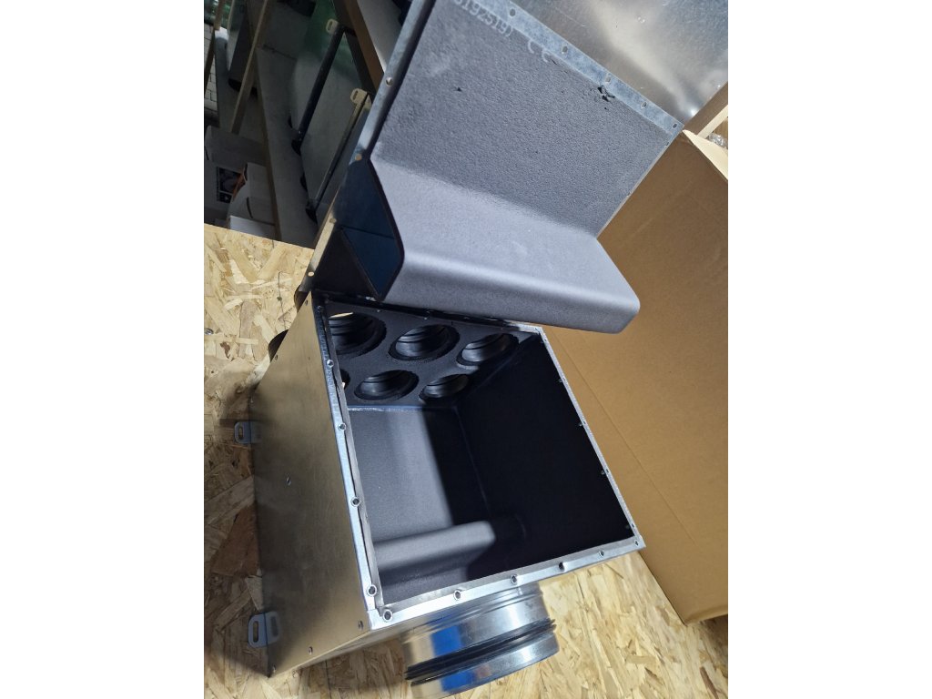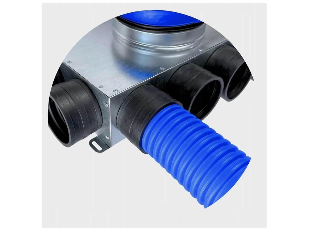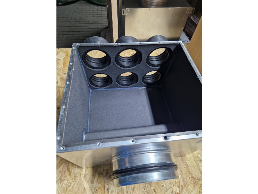 Rozdeľovač je vybavený šiestimi hrdlami Ø90 a pripojením Ø160. Vnútorné tlmenie pomocou antibakteriálnej vrstve znižuje hluk a podporuje hygienu
