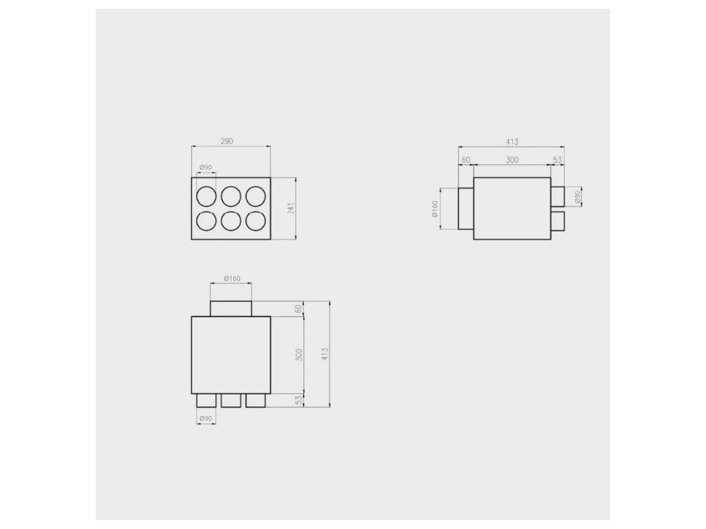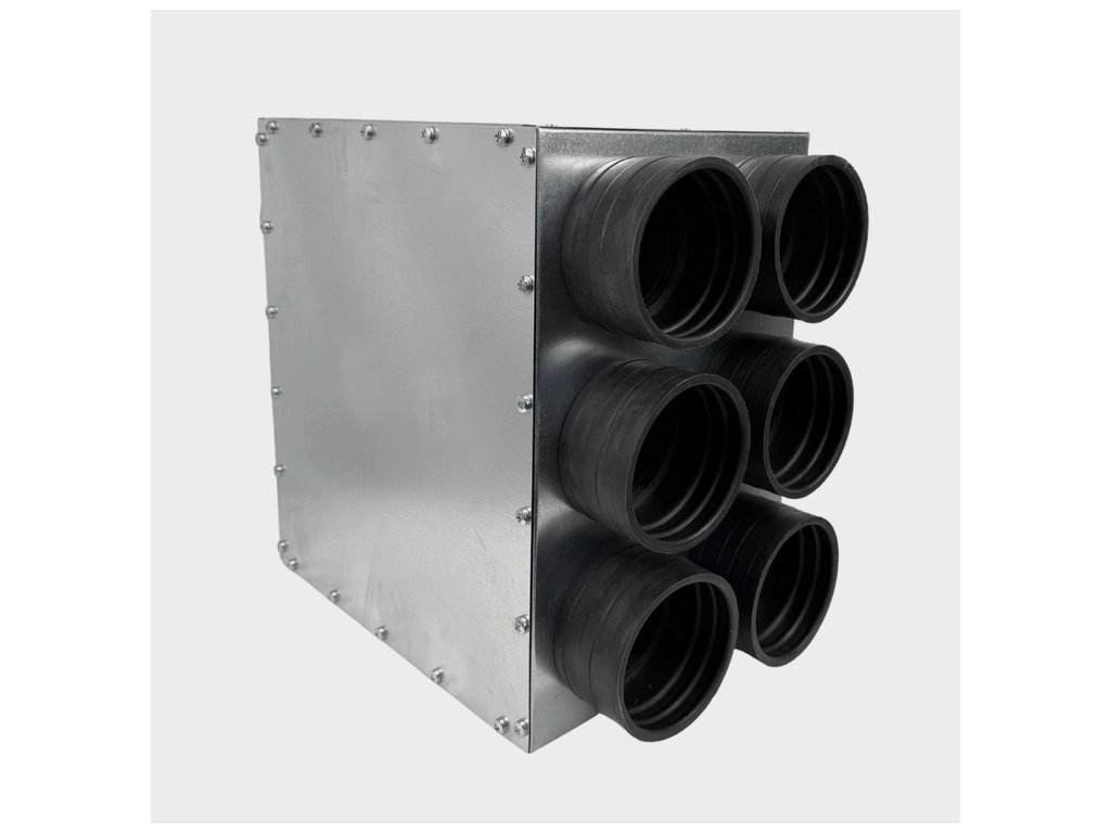 Rozdeľovač 6x90/160 je kompaktná rozdeľovacia skrinka pre prívodné a odvodné systémy pre potrubia s priemerom Ø90.