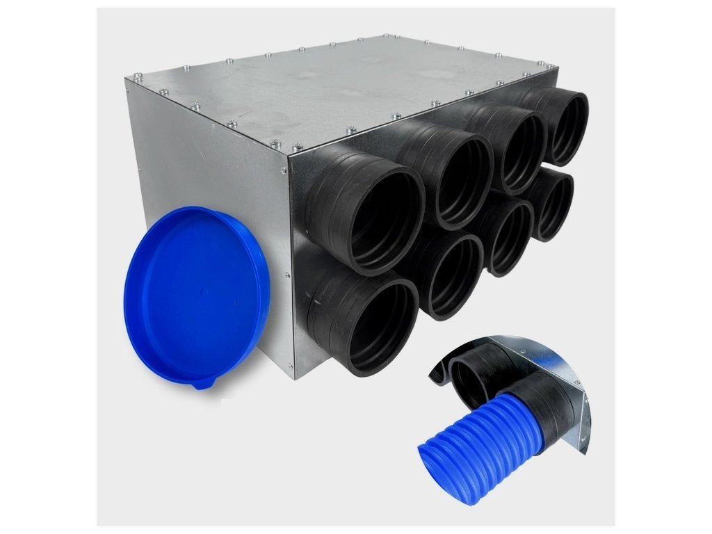 Priamy rozdeľovač 8x90 mm / Ø200 je profesionálna rozdeľovacia skrinka určená pre moderné systémy mechanického vetrania s rekuperáciou tepla (HRV).
